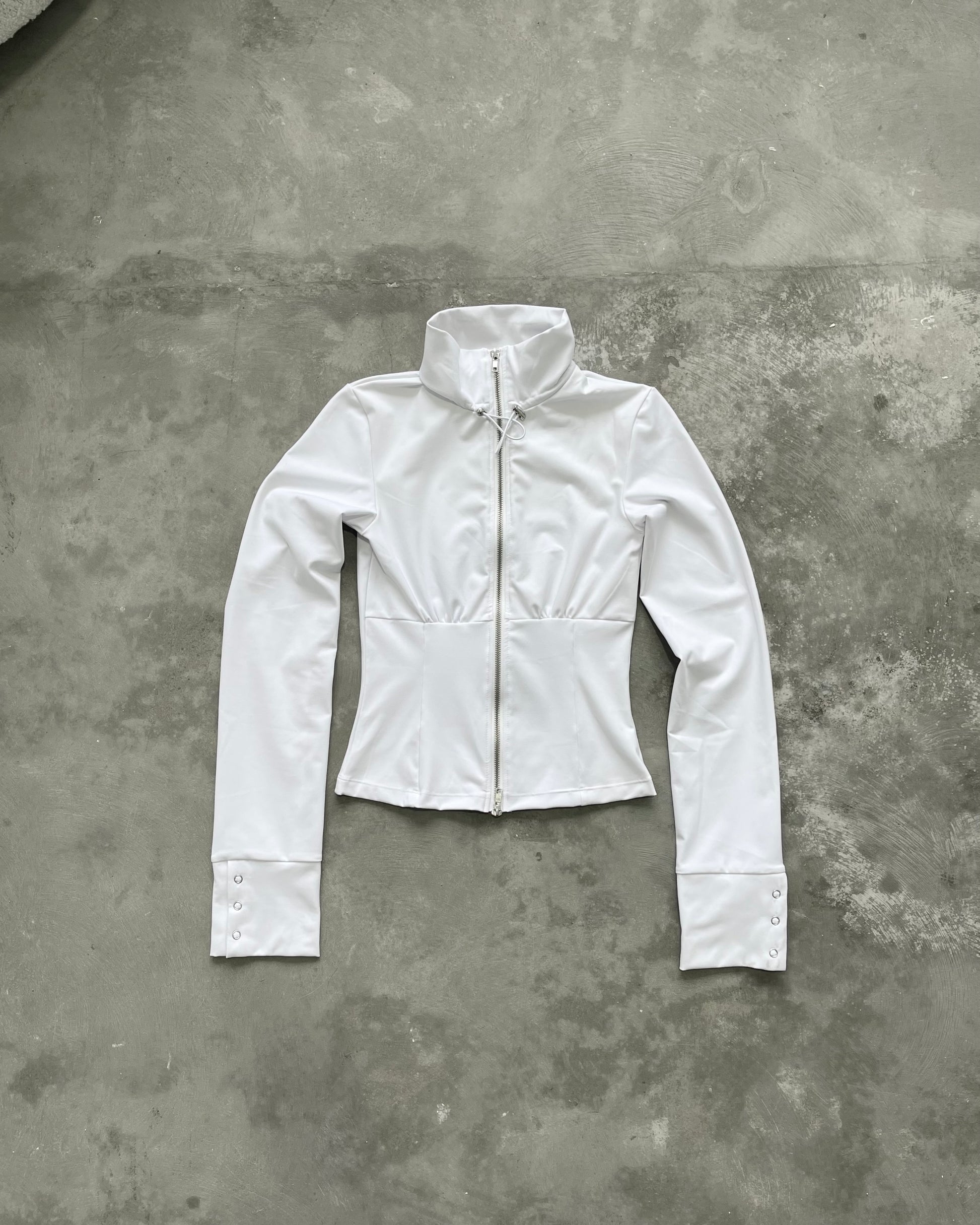 Mid-weight activewear fabrication in a fitted silhouette, adjustable cinches around the neck and snap button detailing on sleeves.